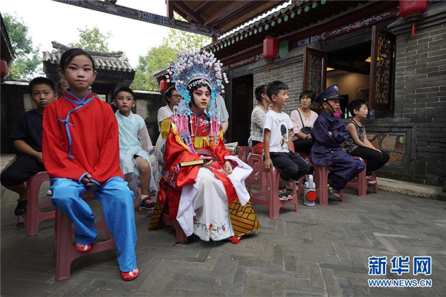 8月20日,孩子們?cè)诤颖笔∏鼗蕧u市北戴河“裴艷玲藝術(shù)傳承基地”觀看京劇表演。