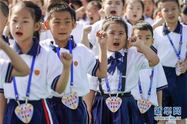 9月1日,在北京市東城區(qū)燈市口小學(xué)燈市口校區(qū)的開學(xué)典禮上,一年級(jí)新生在進(jìn)行入學(xué)宣誓。新華社記者 沈伯韓 攝