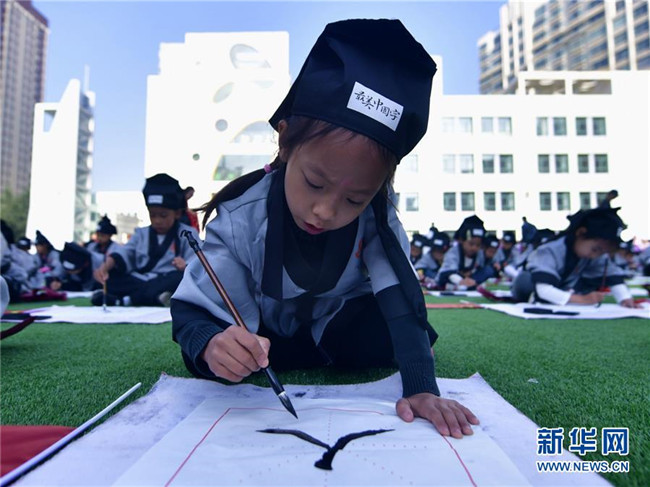 9月1日,青海省西寧市文匯小學(xué)一年級(jí)的學(xué)生在“開筆禮”儀式上書寫“人”字。 新華社記者 張龍 攝