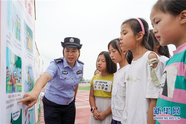 9月1日,南京鐵路東站派出所民警在南京市石埠橋小學(xué)利用漫畫向小學(xué)生宣講安全知識(shí)。 新華社記者 李博 攝