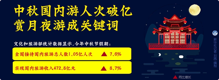 文化和旅游部統(tǒng)計(jì)數(shù)據(jù)顯示,今年中秋節(jié)假期,全國接待國內(nèi)旅游總?cè)藬?shù)1.05億人次,同比增長7.6%;實(shí)現(xiàn)國內(nèi)旅游收入472.8億元,同比增長8.7%。