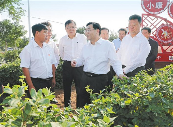9月25日,省委書記胡和平來到蒲城縣堯山鎮(zhèn)閆家村金銀花現(xiàn)代農(nóng)業(yè)園區(qū),察看金銀花長勢,了解畝產(chǎn)、收益和帶動(dòng)脫貧致富效果。記者 宋紅梅攝