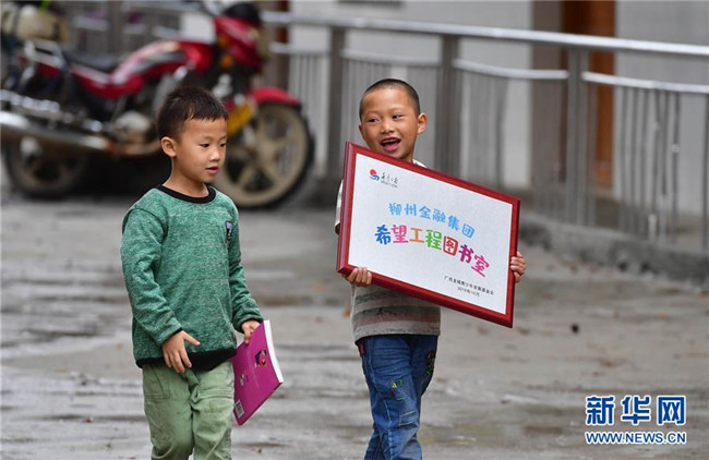 黔桂烏英苗寨的孩子捧著“希望工程圖書(shū)室”的牌匾,準(zhǔn)備懸掛(10月12日攝)。新華社記者 黃孝邦 攝