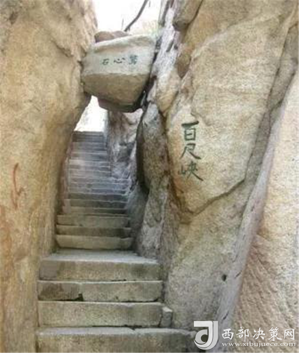 出千尺幢不遠是百尺峽,這里是登山第二道險關。雖沒有千尺幢那么長,僅46米,石階91級,但仍是華山天險之一。這里勢危坡陡,石壁峭立,通道狹窄,且有懸石,搖搖欲墜。游人至此都心驚膽顫。明顧端木有詩狀其險曰:"幢去峽復來,天險不可瞬。雖云百尺峽,一尺一千仞。"千尺幢、百尺峽的臺階都是從明末清初開始鑿的,民國時幾經加固,解放后又多次修整,一九八五年又鑿復道,游人上下各行其道。