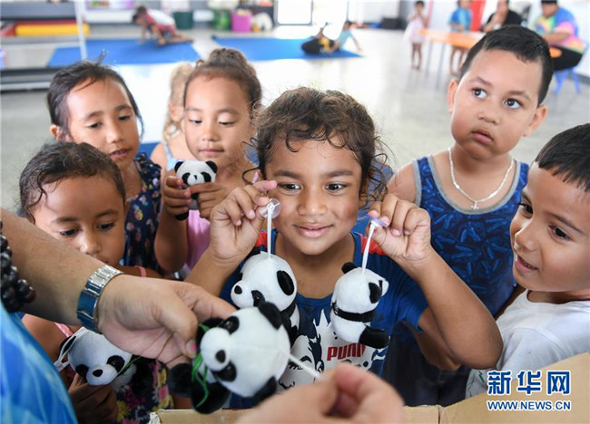 10月26日,在庫克群島首都阿瓦魯阿的阿皮尼考學(xué)校,幼兒園的孩子手拿來自中國的熊貓掛件。