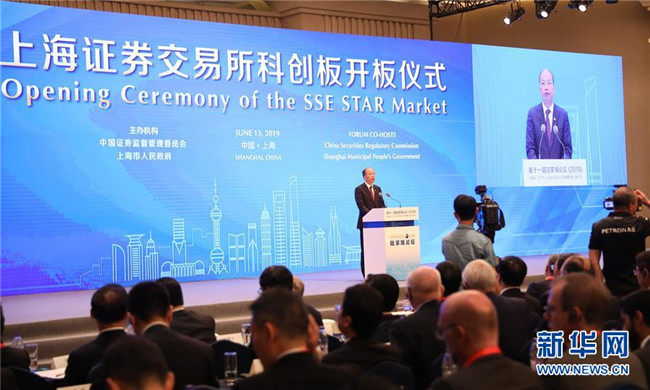 上海證券交易所科創(chuàng)板開板儀式在陸家嘴論壇上舉行。這是中國(guó)證監(jiān)會(huì)主席易會(huì)滿在開板儀式上致辭(6月13日攝)。新華社記者 方喆攝
