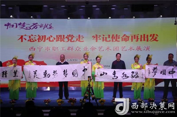 文藝展演由民樂演奏《歡天喜地迎盛世》、《牧民新歌》伴著各大書畫院書法家現(xiàn)場潑墨書法“中國夢”、“業(yè)精于勤”等作品中拉開序幕,潑墨書法、民樂演奏、花兒聯(lián)唱、歌伴舞、小合唱、詩朗誦、二重唱、秦腔樣板戲等富有時代特色、職工群眾喜聞樂見接地氣的節(jié)目輪番登臺?!对谙M奶镆吧稀芳で榍啻旱奈璧?、合唱《把幸福和快樂送給你》優(yōu)美動聽的原創(chuàng)歌曲、秦腔樣板戲《紅燈記》選段等節(jié)目抒發(fā)了西寧市廣大職工群眾“砥礪奮進(jìn)新時代 譜寫西寧新篇章”的豪情。展演現(xiàn)場為觀眾分發(fā)了關(guān)于“不忘初心 牢記使命”主題教育和《西寧市文明促進(jìn)條例》的宣傳資料,通過互動知識競答方式普及相關(guān)知識,觀眾踴躍搶答,氣氛熱烈。精彩的表演贏得了在場職工群眾朋友們的陣陣掌聲,網(wǎng)絡(luò)直播點擊評論互動熱烈,展演在全體演職人員和觀眾齊聲共唱《我和我的祖國》中推向了最高潮。