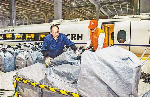 11月12日晚,重慶西站,工作人員正在卸載G8595次列車上的快件。為應(yīng)對(duì)“雙11”帶來的巨量物流,重慶鐵路部門利用高鐵動(dòng)車組、旅客列車行李車等運(yùn)力資源,提供物流服務(wù)。記者龍帆攝