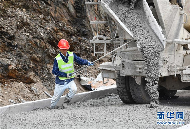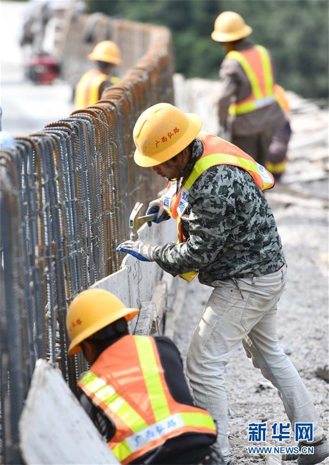11月19日,在廣西融水苗族自治縣四榮鄉(xiāng),工人在羅融二級(jí)公路建設(shè)現(xiàn)場(chǎng)施工。新華社記者 黃孝邦 攝