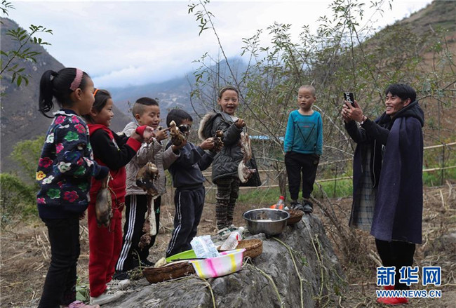 11月24日,在昭覺縣支爾莫鄉(xiāng)阿土列爾村,村民阿牛用手機拍攝孩子們向大家拜年的視頻。