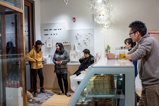 11月24日,北京定福莊一家自習(xí)室內(nèi),兩位顧客在學(xué)習(xí)間隙下樓休息放松,與店員聊天。