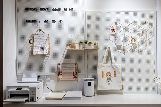 11月24日,北京定福莊一家自習(xí)室一角。這里為顧客提供打印服務(wù)和免費(fèi)的紙張,一旁展示的是店家設(shè)計(jì)的帆布包。