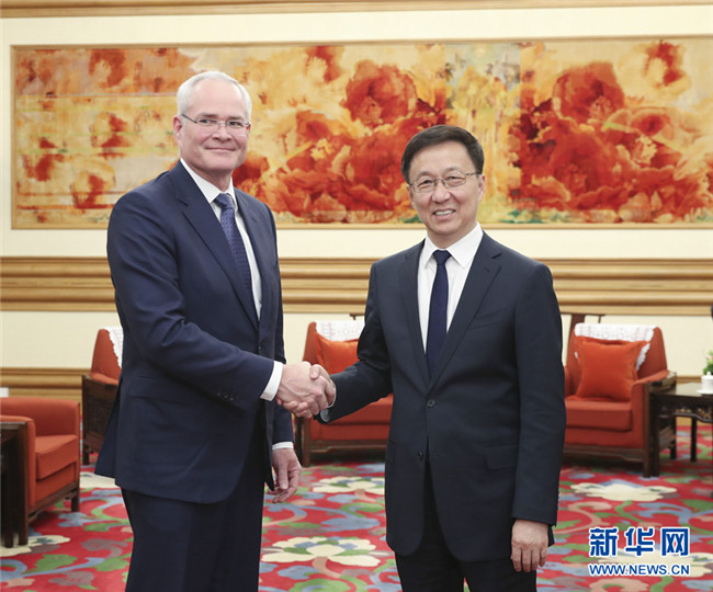 中共中央政治局常委、國(guó)務(wù)院副總理韓正3日在中南海會(huì)見美國(guó)埃克森美孚公司董事長(zhǎng)兼首席執(zhí)行官伍德倫。