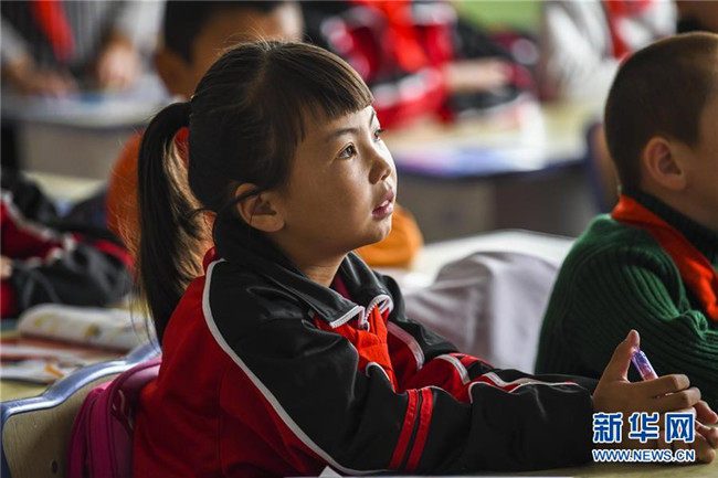 在哈密幸福村小學(xué)里,孩子們?cè)谧稣n間操(10月22日攝)。新華社記者 趙戈 攝