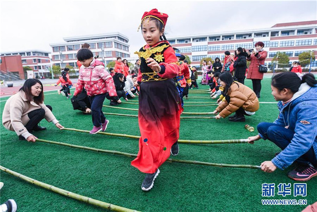 12月26日,身著少數(shù)民族服裝的孩子與同學們一起體驗竹竿舞趣味活動。當日,浙江省長興縣李家巷鎮(zhèn)中心幼兒園舉辦“炫彩民族風歡樂來運動”為主題的趣味民族游戲活動。該幼兒園有一些孩子來自壯族、苗族、布依族等少數(shù)民族。幼兒園旨在通過這種活動,讓孩子們和家長共同體驗竹竿舞、篝火舞、擲糠包等少數(shù)民族特色游戲,了解少數(shù)民族特色文化。新華社記者徐昱攝