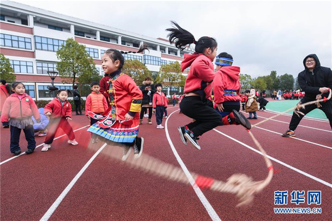 12月26日,孩子們在參加跳花繩活動。當日,浙江省長興縣李家巷鎮(zhèn)中心幼兒園舉辦“炫彩民族風歡樂來運動”為主題的趣味民族游戲活動。該幼兒園有一些孩子來自壯族、苗族、布依族等少數(shù)民族。幼兒園旨在通過這種活動,讓孩子們和家長共同體驗竹竿舞、篝火舞、擲糠包等少數(shù)民族特色游戲,了解少數(shù)民族特色文化。新華社記者徐昱攝