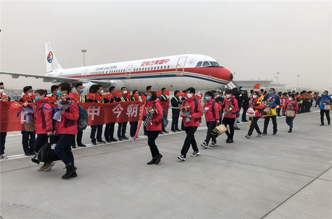 寧夏第五、第六批援湖北醫(yī)療隊員乘飛機抵達銀川。高嘉蔚 攝