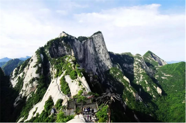 華山自誕生之日起,就有別于秦嶺其他山峰。地殼在運(yùn)動時(shí),偶然形成了這一塊完整碩大的花崗巖,伴隨著轟鳴聲,這塊巨大的花崗巖從地殼中涌出,并崩裂成五塊:東南西北中五座山峰,遠(yuǎn)看貌似蓮花,古代花、華想通,因而被稱為華山。