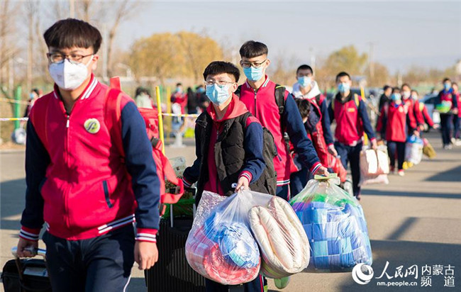 內(nèi)蒙古呼和浩特市第十二中學住校學生在搬運行李。