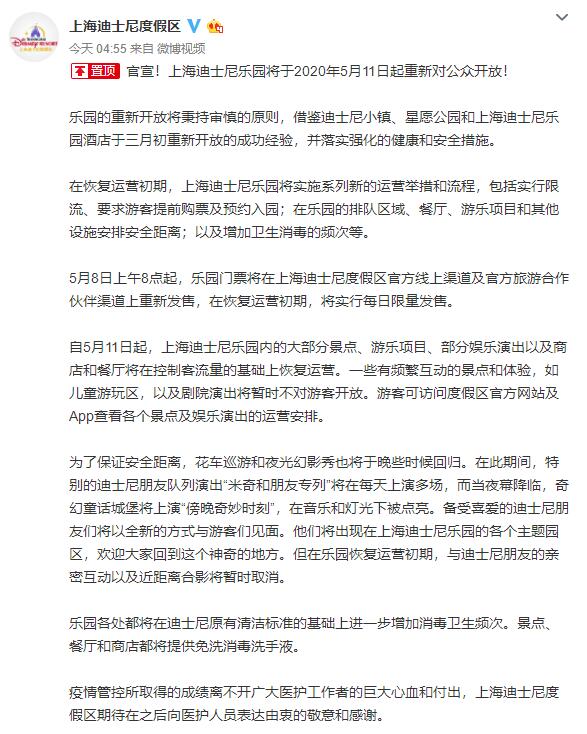 據(jù)上海迪士尼度假區(qū)官方微博消息,上海迪士尼樂園將于2020年5月11日起重新對公眾開放。在恢復運營初期,上海迪士尼樂園將實施系列新的運營舉措和流程,包括實行限流、要求游客提前購票及預約入園,在樂園的排隊區(qū)域、餐廳、游樂項目和其他設施安排安全距離,以及增加衛(wèi)生消毒的頻次等。