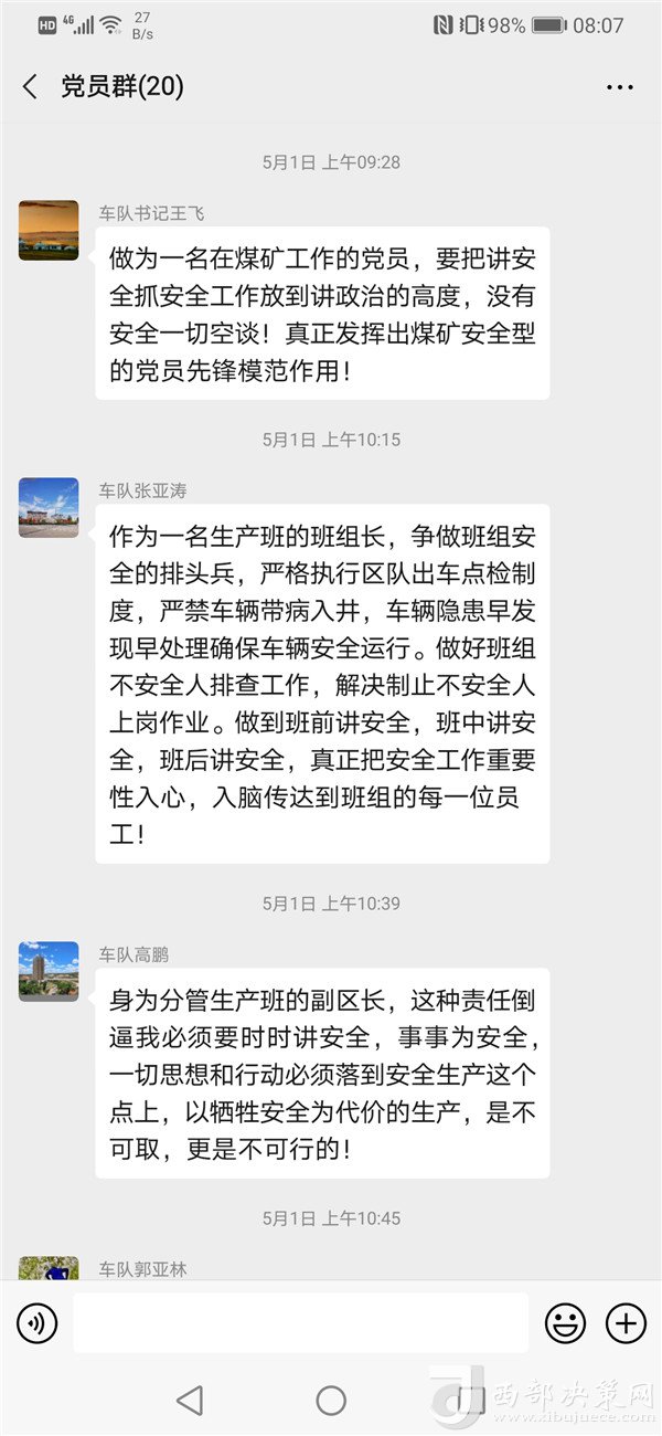 活動(dòng)期間,支部20名黨員認(rèn)真學(xué)習(xí)貫徹集團(tuán)公司、陜北礦業(yè)公司和公司近期安全生產(chǎn)文件材料宣貫落實(shí)精神,深刻吸取安全生產(chǎn)事故教訓(xùn),圍繞“守住安全生產(chǎn)這一‘生命線’,牢固確立‘四個(gè)最’的意識(shí)”工作目標(biāo),展開了圍繞分管業(yè)務(wù)、自身崗位特點(diǎn)的討論學(xué)習(xí)。此次主題黨日活動(dòng),支部黨員紛紛談體會(huì)、講心得,結(jié)合工作中遇到的經(jīng)典案例,剖析了自身工作存在的短板和不足,并提出了具體的改進(jìn)措施。同時(shí),表示在今后工作中將充分發(fā)揮黨員的先鋒模范作用,擔(dān)當(dāng)作為、履職盡責(zé),做到帶頭反三違、帶頭降三違、身邊無三違。