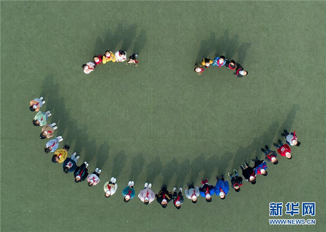5月8日,江蘇省泰州市大馮中心小學(xué)學(xué)生在操場(chǎng)上拼出笑臉圖案(無(wú)人機(jī)照片)。 當(dāng)日是世界微笑日。 新華社發(fā)(湯德宏 攝)