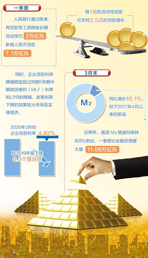 從引導貸款投放看,一季度中國人民銀行通過降準、再貸款等工具釋放長期流動性約2萬億元,新增人民幣貸款7.1萬億元,每1元的流動性投放可支持3.5元的貸款增長,是1∶3.5的倍數(shù)放大效應。