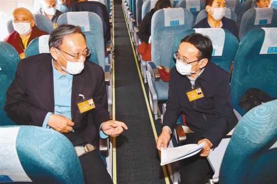 5月20日,全國政協(xié)委員、西藏人民醫(yī)院副院長格桑羅布(左)與全國政協(xié)委員、西藏大學(xué)科研處處長圖登克珠在前往北京途中就如何在全國兩會上建言獻(xiàn)策、履職盡責(zé)進(jìn)行交流。本報(bào)記者 旦增西旦 攝