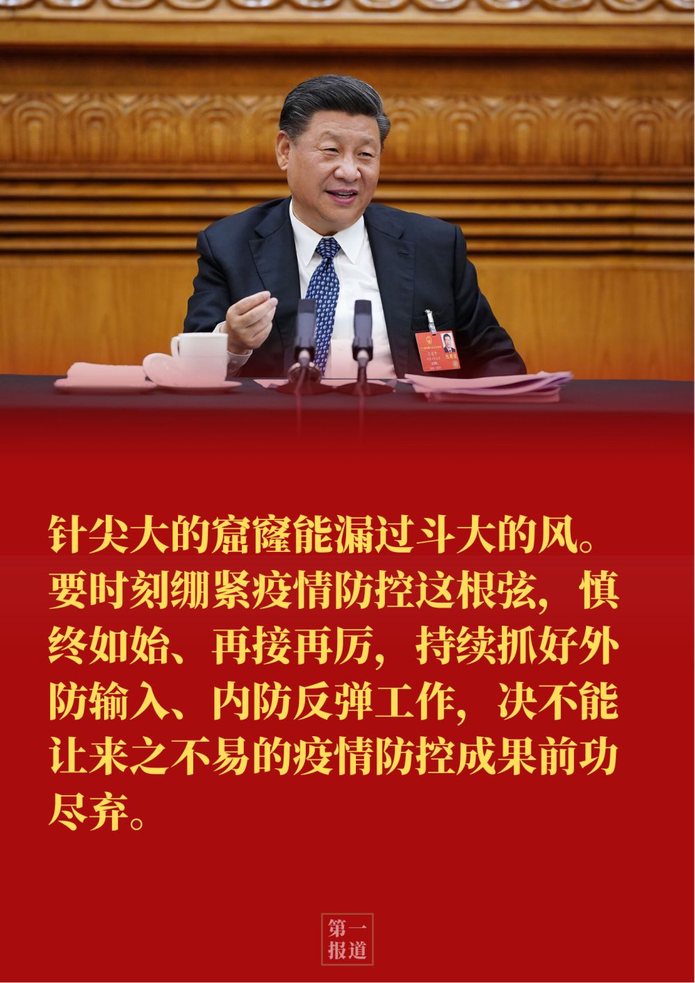 習(xí)近平指出:“針尖大的窟窿能漏過斗大的風(fēng)。要時(shí)刻繃緊疫情防控這根弦,慎終如始、再接再厲,持續(xù)抓好外防輸入、內(nèi)防反彈工作,決不能讓來之不易的疫情防控成果前功盡棄。”