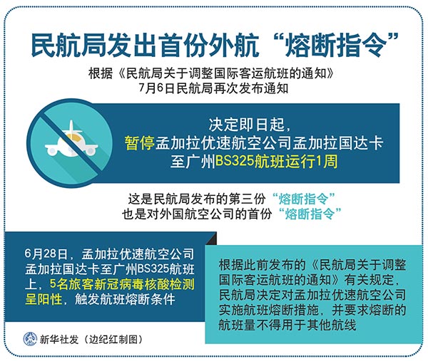 根據(jù)此前發(fā)布的《民航局關(guān)于調(diào)整國際客運(yùn)航班的通知》有關(guān)規(guī)定,民航局決定對孟加拉優(yōu)速航空公司實(shí)施航班熔斷措施,并要求熔斷的航班量不得用于其他航線。(記者齊中熙)