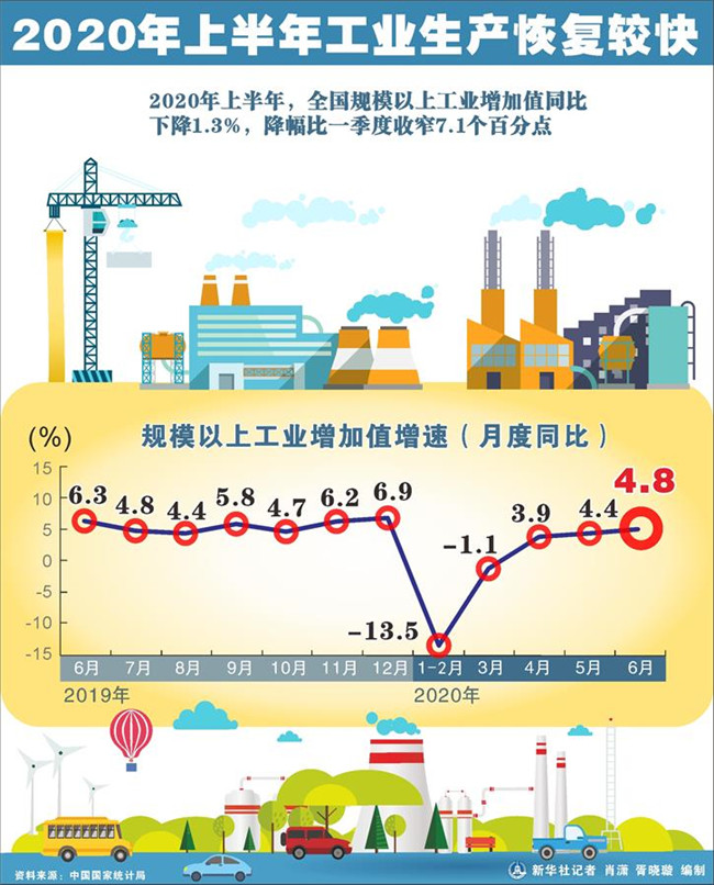 圖表:2020年上半年工業(yè)生產(chǎn)恢復(fù)較快 新華社記者 肖瀟 胥曉璇 編制