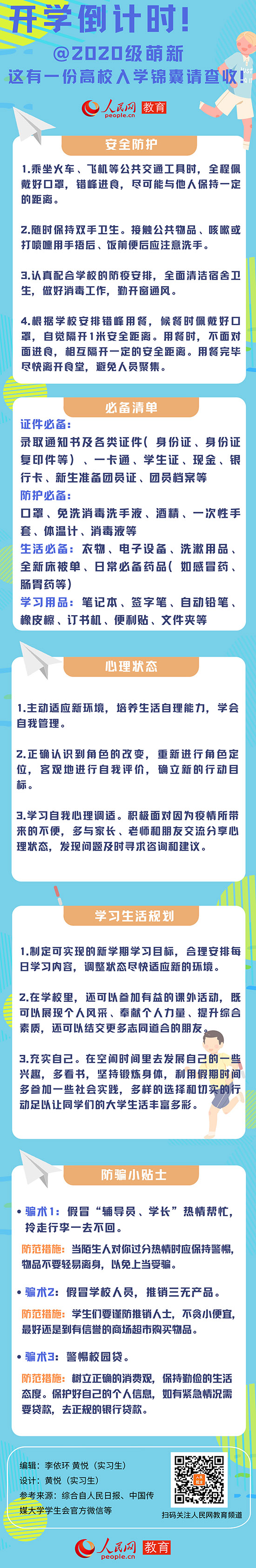 當(dāng)前,全國(guó)多地高校已經(jīng)陸續(xù)公布秋季開學(xué)時(shí)間,大學(xué)校園即將迎來(lái)“萌新”報(bào)到。人民網(wǎng)教育頻道特別梳理了一份入學(xué)錦囊,請(qǐng)即將步入新階段的學(xué)子們查收,元?dú)鉂M滿開啟大學(xué)校園生活。(李依環(huán) 實(shí)習(xí)生黃悅)