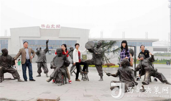 華山北站廣場(chǎng)上的老腔雕塑,老腔是陜西省非常古老的漢族戲曲表演形式,長期在華陰廣泛流傳,分老腔、時(shí)腔兩個(gè)劇種,表演方法和全國大致相同,先搭好臺(tái)子、撐好"亮子",然后借助燈火,以竹簽挑撥用皮革雕成的人物進(jìn)行舞臺(tái)表演。流傳千年的老腔是中國首批國家級(jí)非物質(zhì)遺產(chǎn)保護(hù)項(xiàng)目。