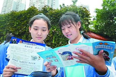 9月15日,四川省內(nèi)江市東興初級中學學生正在閱讀網(wǎng)絡(luò)安全宣傳資料。蘭自濤攝/光明圖片