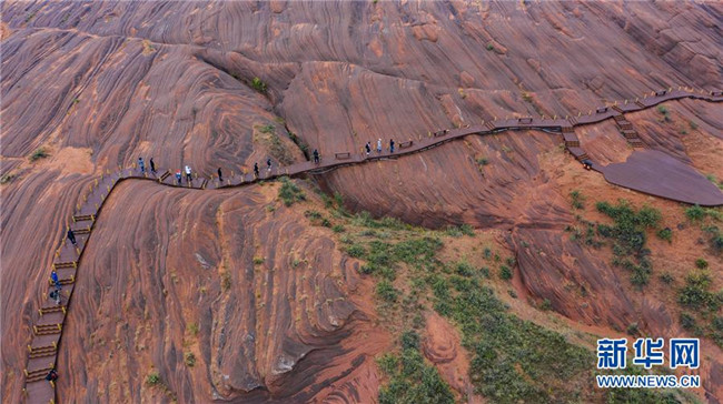 游人在靖邊縣龍洲鎮(zhèn)波浪谷丹霞景區(qū)游覽(9月24日攝,無人機照片)。新華社記者 陶明 攝