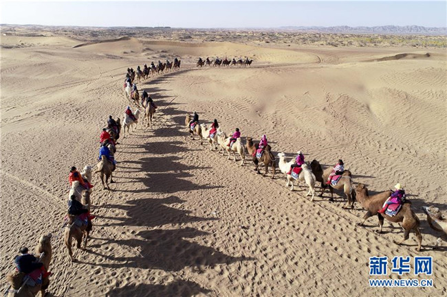10月21日,游客在阿拉善通湖草原旅游區(qū)體驗(yàn)沙漠乘駱駝旅游項(xiàng)目(無人機(jī)照片)。 新華社發(fā)(王正 攝)