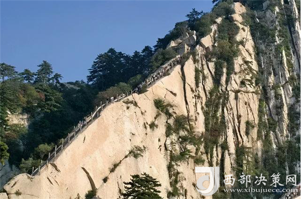 華山的路奇,“自古華山一條路”是一道奇觀,這條路或越澗跨溝,或臨崖盤山,或入崖間深谷,或走峭壁嶺脊,或平坦或曲陡,或?qū)挸ɑ颡M窄,曲折變化,跌宕起伏,把人帶入意境深邃的萬般景象之中。