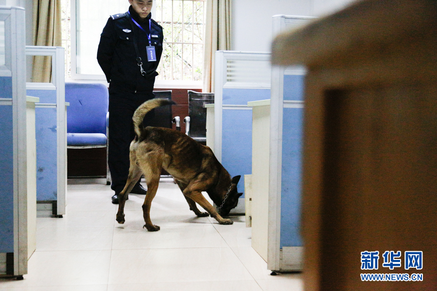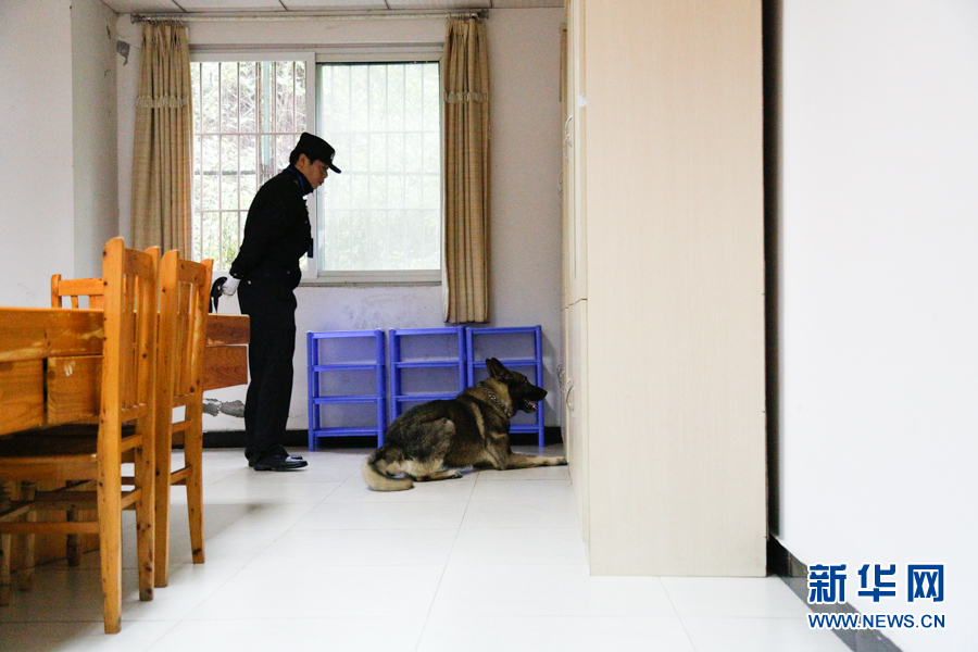 警犬正在房間內搜索可疑物品。新華網(wǎng)發(fā)(耿駿宇 攝)
