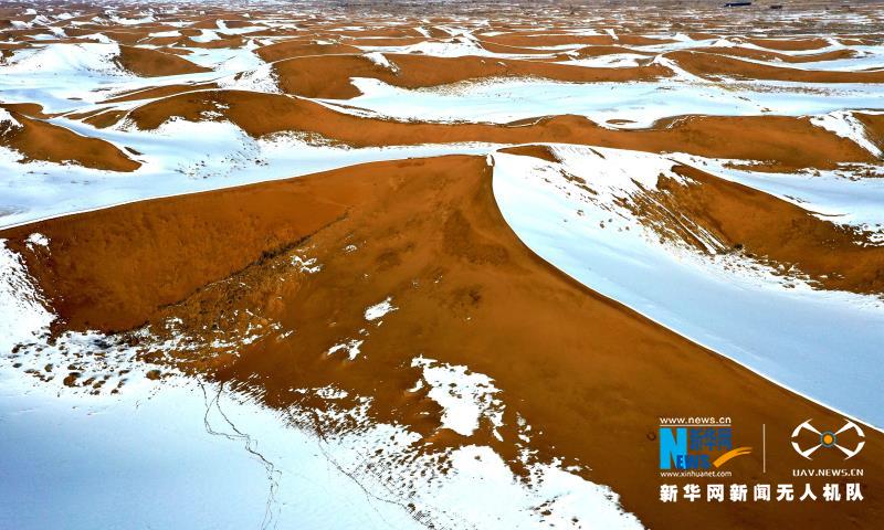 近日,一場降雪將甘肅省武威市民勤縣境內的騰格里沙漠裝扮得分外妖嬈,黃沙白雪相互交融,宛如一幅壯美畫卷在天地間鋪展。新華網(wǎng)發(fā)(馬愛彬 攝)