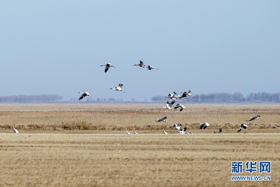在內(nèi)蒙古扎賚特旗圖牧吉國家級自然保護(hù)區(qū)拍攝的白鶴(11月6日攝)?!⌒氯A社發(fā)(畢力格 攝)