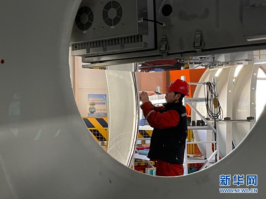 11月26日,在金風(fēng)風(fēng)電設(shè)備科技有限公司生產(chǎn)車間,工人在加工風(fēng)機(jī)組件?!⌒氯A社記者 安路蒙 攝