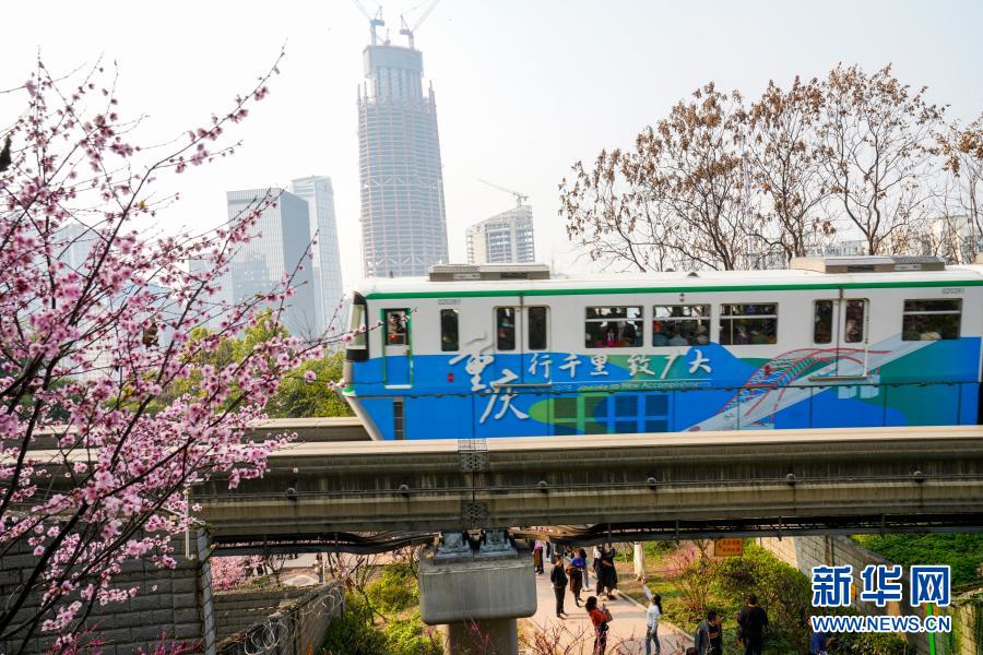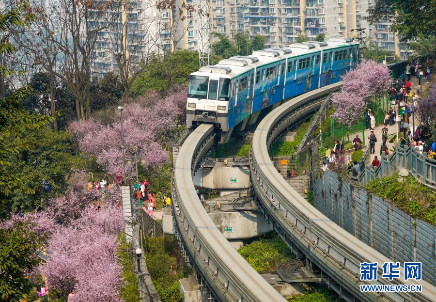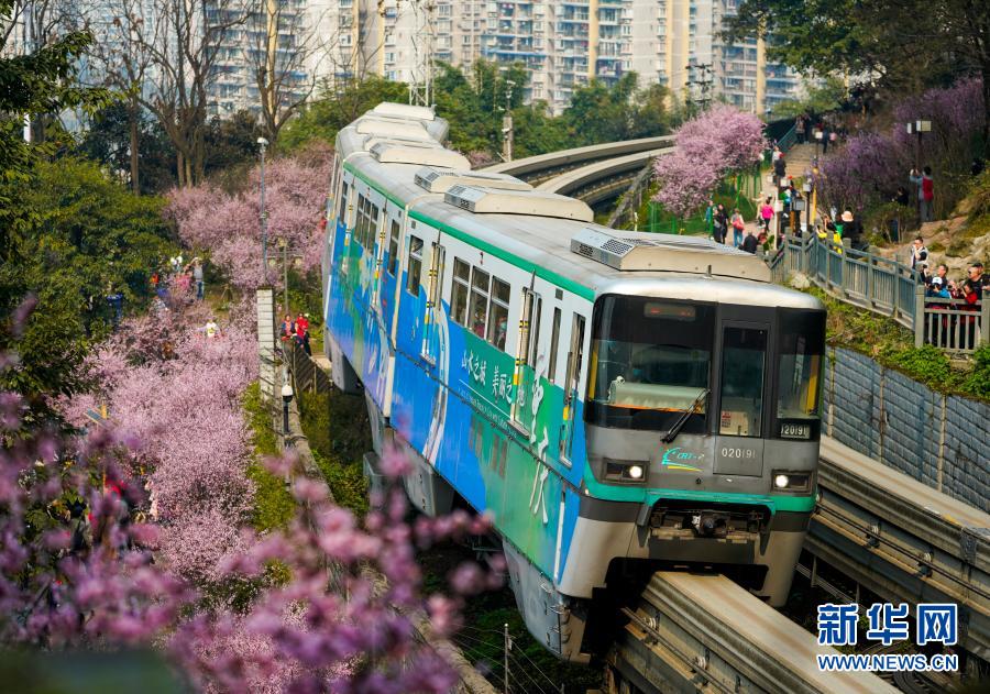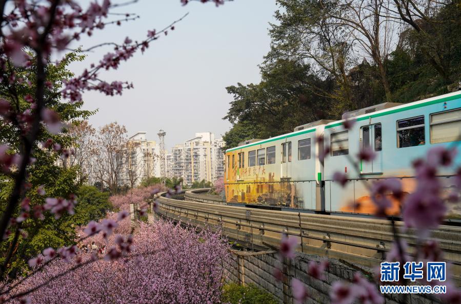 2月23日,在重慶軌道交通2號(hào)線佛圖關(guān)段,一列單軌列車穿越花海奔馳而過(guò)。新華社記者 劉潺 攝