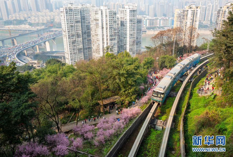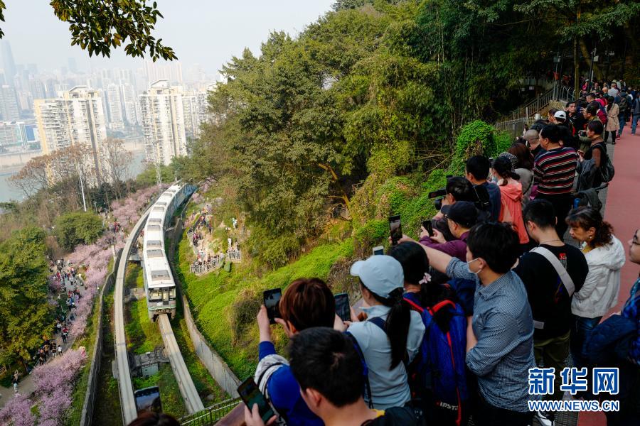 2月23日,在重慶軌道交通2號(hào)線佛圖關(guān)段,游客在山城步道上拍攝穿越花海的單軌列車。新華社記者 劉潺 攝