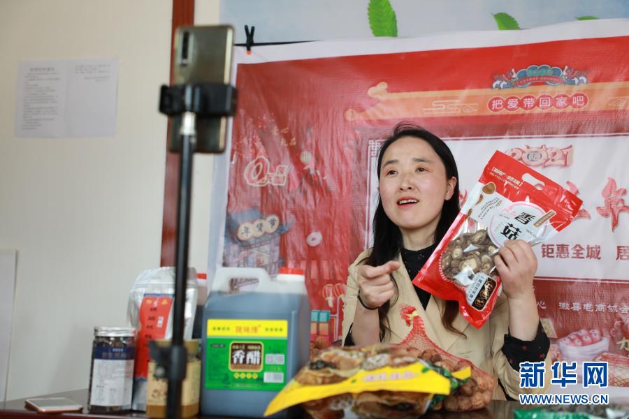 2月23日,在位于甘肅隴南市徽縣的店鋪中,全國(guó)人大代表梁倩娟在網(wǎng)上直播銷售當(dāng)?shù)剞r(nóng)特產(chǎn)品。 新華社記者 張智敏 攝