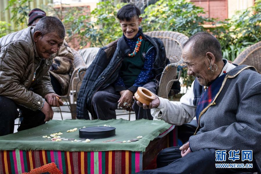 次旦(右)在集中供養(yǎng)服務(wù)中心和朋友們一起進(jìn)行娛樂活動(dòng)(3月19日攝)。