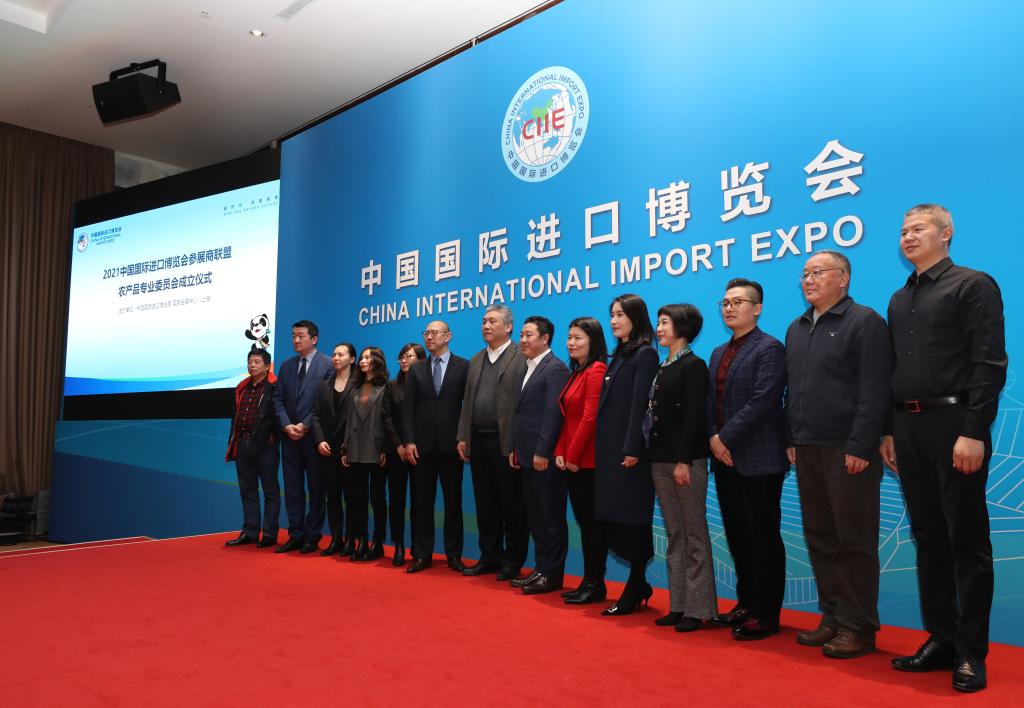 1月20日,進(jìn)博會(huì)參展商聯(lián)盟農(nóng)產(chǎn)品專(zhuān)業(yè)委員會(huì)成員企業(yè)代表與嘉賓在專(zhuān)委會(huì)成立儀式上合影。新華社記者方喆 攝