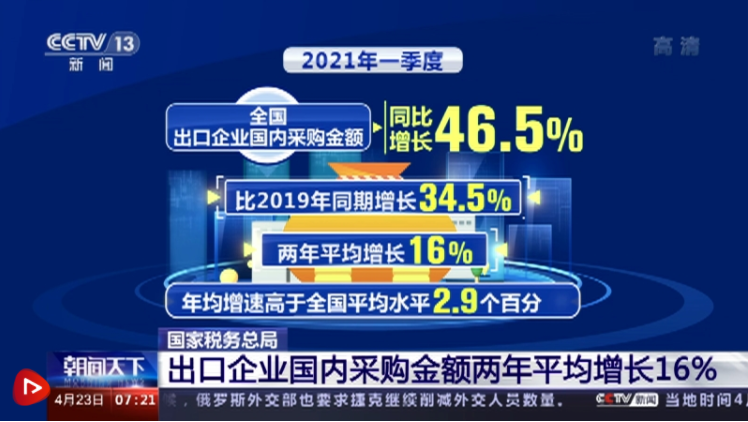 從稅收看經(jīng)濟|一季度全國出口企業(yè)國內(nèi)采購金額同比增長46.5%