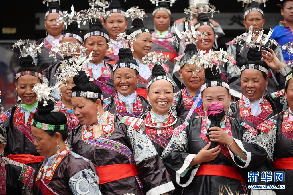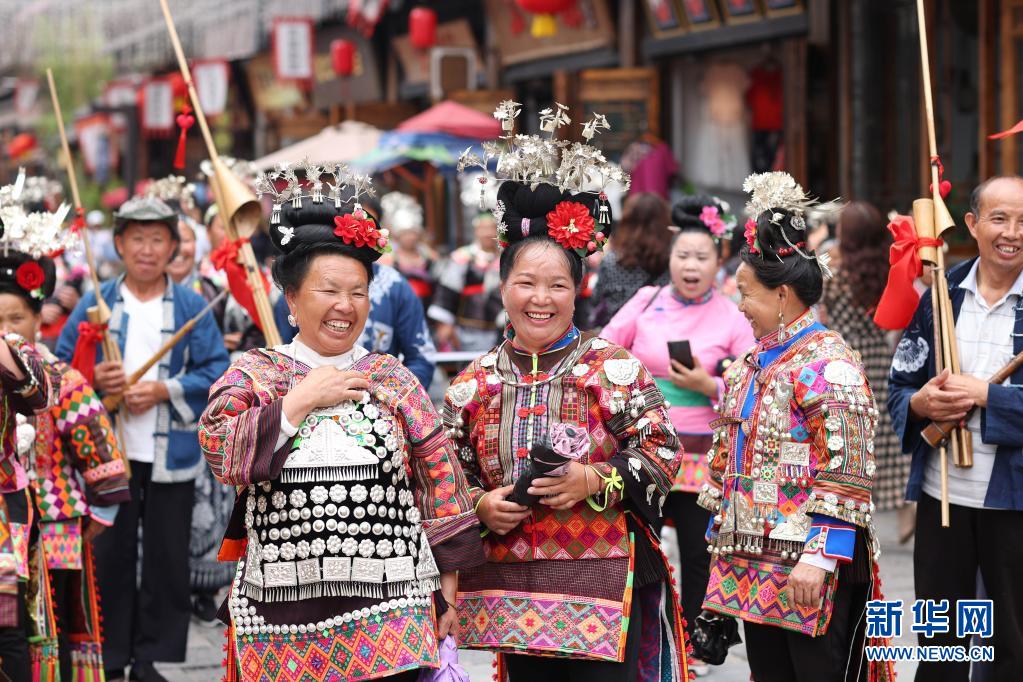 當日,貴州省黔東南苗族侗族自治州丹寨縣萬達小鎮(zhèn)在“第二屆中國丹寨非遺周”中舉辦苗族盛裝巡游、非遺歌舞展演活動。
