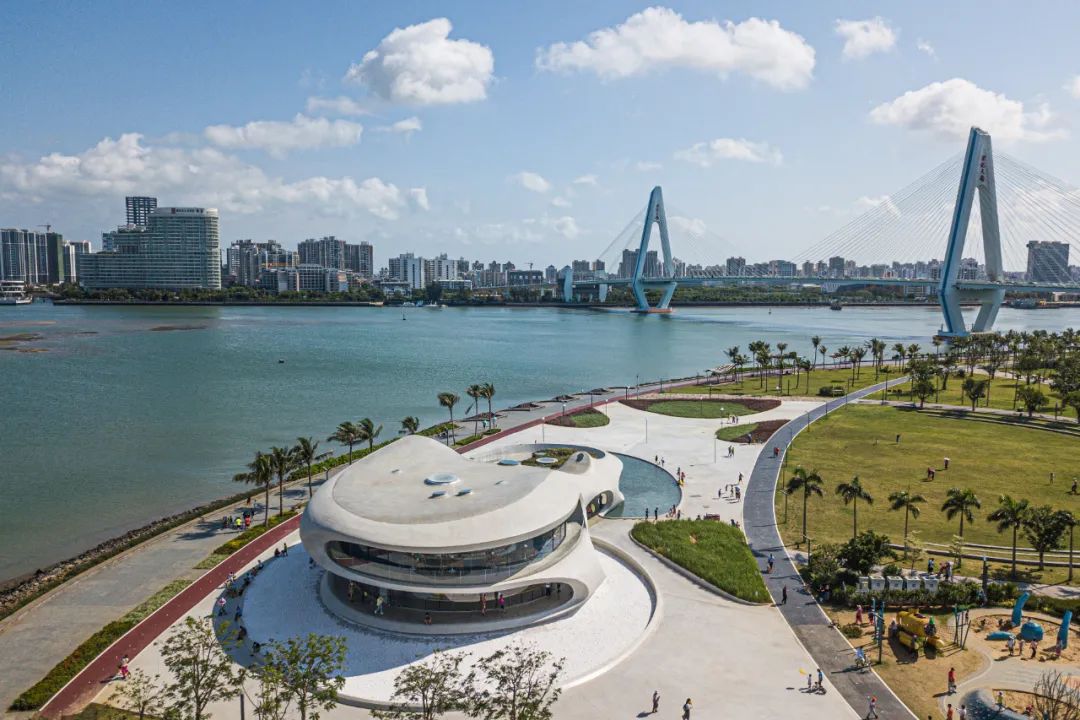 ▲“十四五”開局之年,也是海南全面深化改革開放和加快建設自由貿(mào)易港關鍵之年。這是5月3日在??谂臄z的云洞圖書館,遠處是??诘貥耸兰o大橋(無人機照片)。新華社記者 蒲曉旭 攝