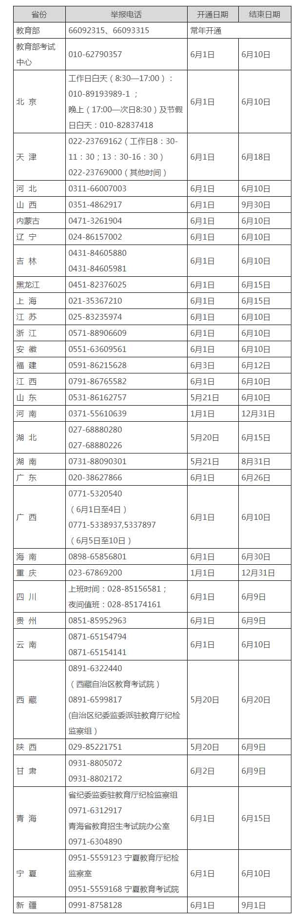 近日,教育部統(tǒng)一公布了教育部以及全國31個?。▍^(qū)、市)教育行政部門和招生考試機構2021年的高考舉報電話,歡迎廣大考生、家長及社會各界人士及時舉報反映涉及2021年高考的問題線索。教育部及各?。▍^(qū)、市)將會同有關部門根據舉報線索第一時間核查處理,堅決維護高考公平公正。